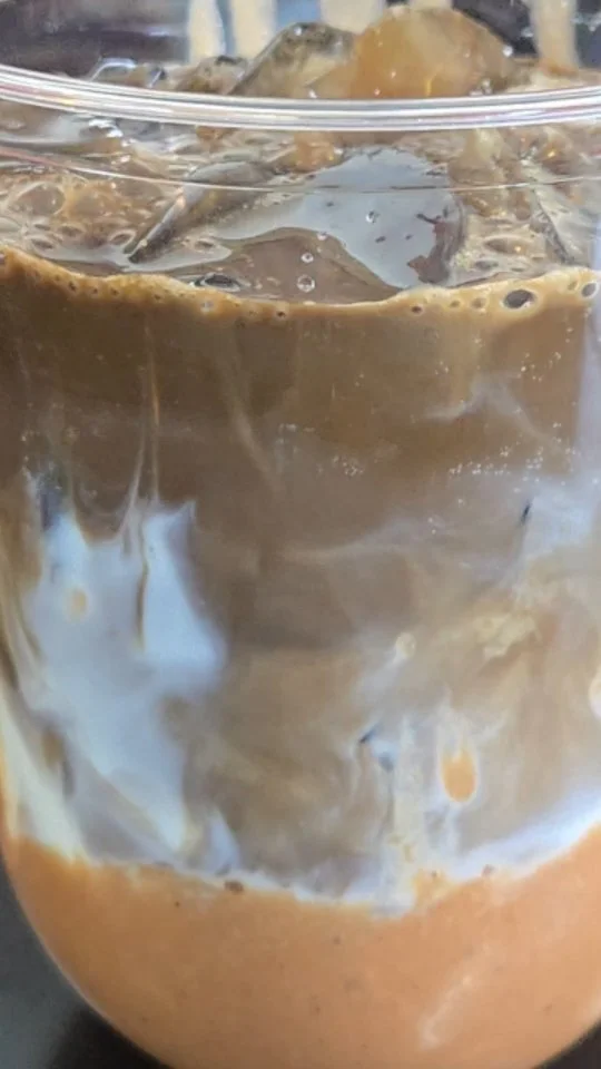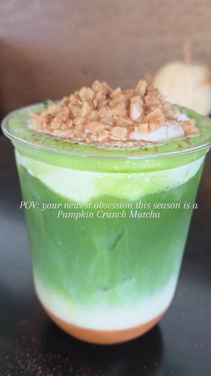 ● PUMPKIN CRUNCH 🎃 Homemade pumpkin pie sauce, milk, choice of Matcha, Hojicha, or Espresso, topped with sweet cream and crunchy toffee bits.